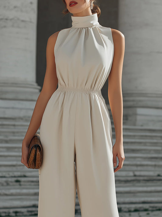 High-Neck Gathered Waist Wide-Leg Jumpsuit