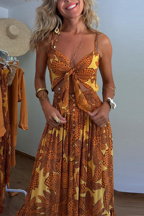 Bedrucktes Maxi-Cremekleid mit Knoten an den Schultern, gedrehter Vorderseite und Cut-Out