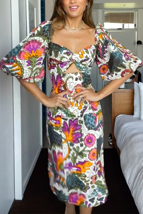 Bedrucktes Midikleid mit verdrehter Vorderseite, Puffärmeln, Cut-Outs und Blumenmuster