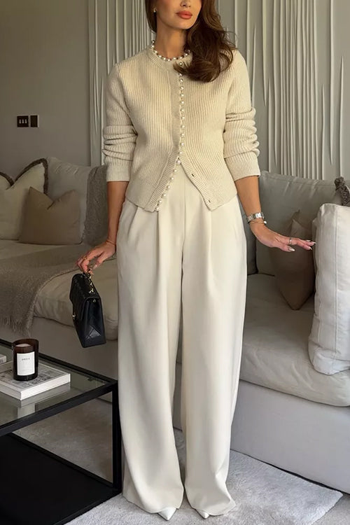 Gerippter Strickpullover mit Rundhalsausschnitt, Perlenbesatz und Knopfleiste