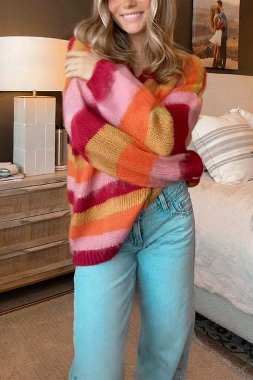 Lässiger Pullover mit V-Ausschnitt und Regenbogenstreifen