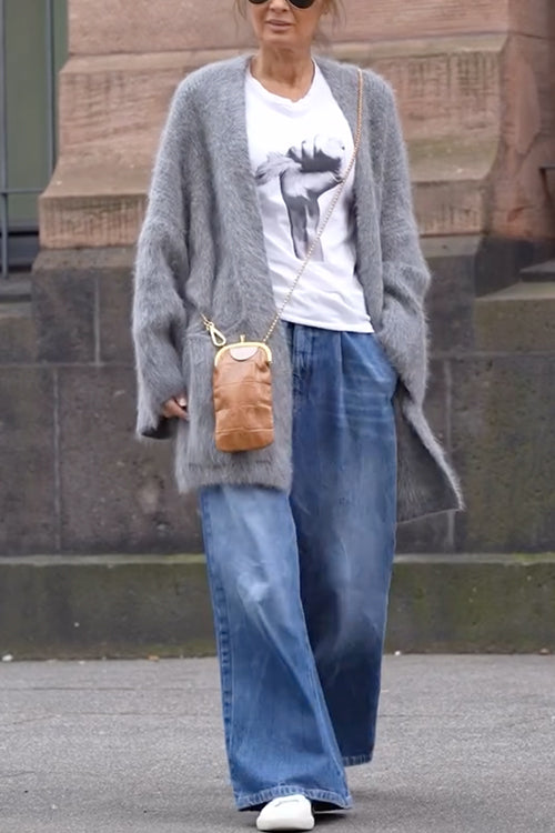 Flauschiger, lässiger Pullover mit offener Vorderseite und Taschen