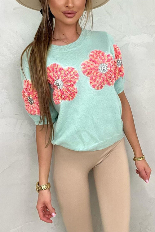 Pullover mit Rundhalsausschnitt, kurzen Ärmeln und 3D-Blumenmuster