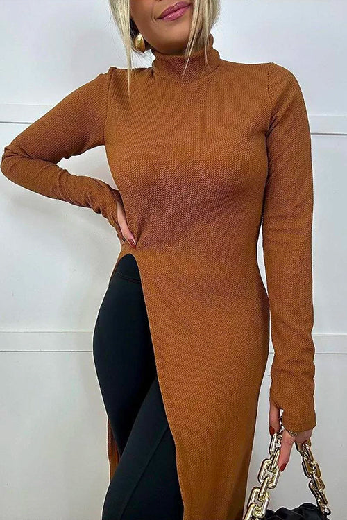Langes Pulloveroberteil mit Rollkragen, hohem Schlitz und Daumenlöchern