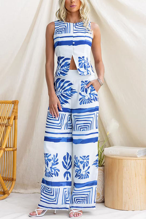 Crewneck Sleeveless Button Up Printed Top