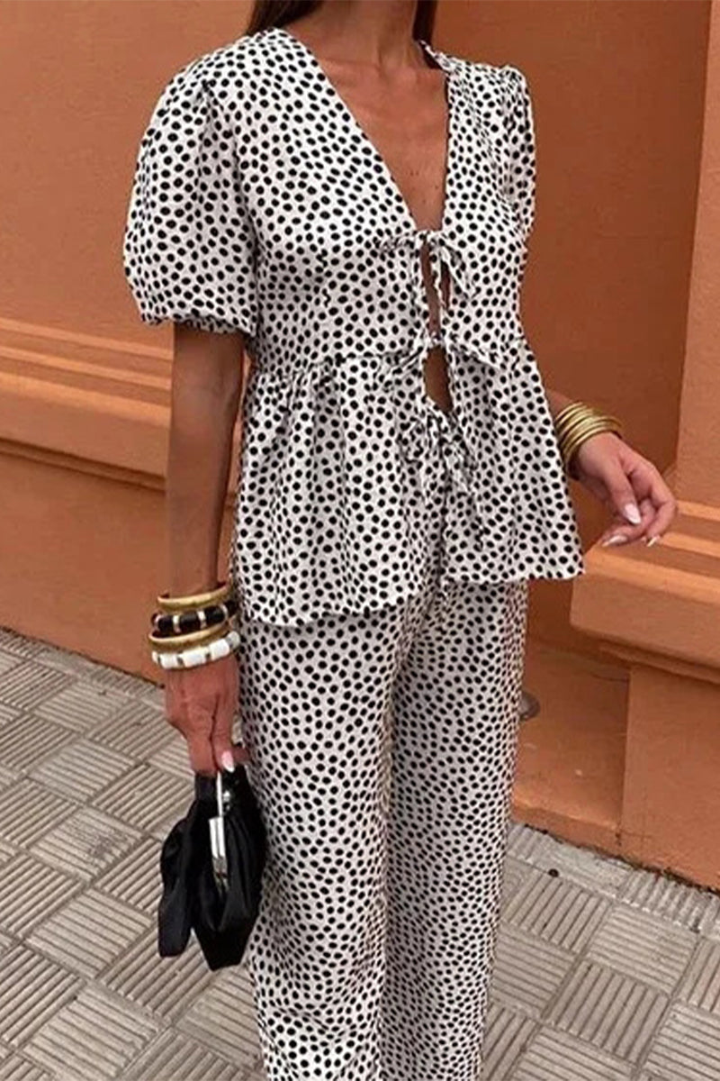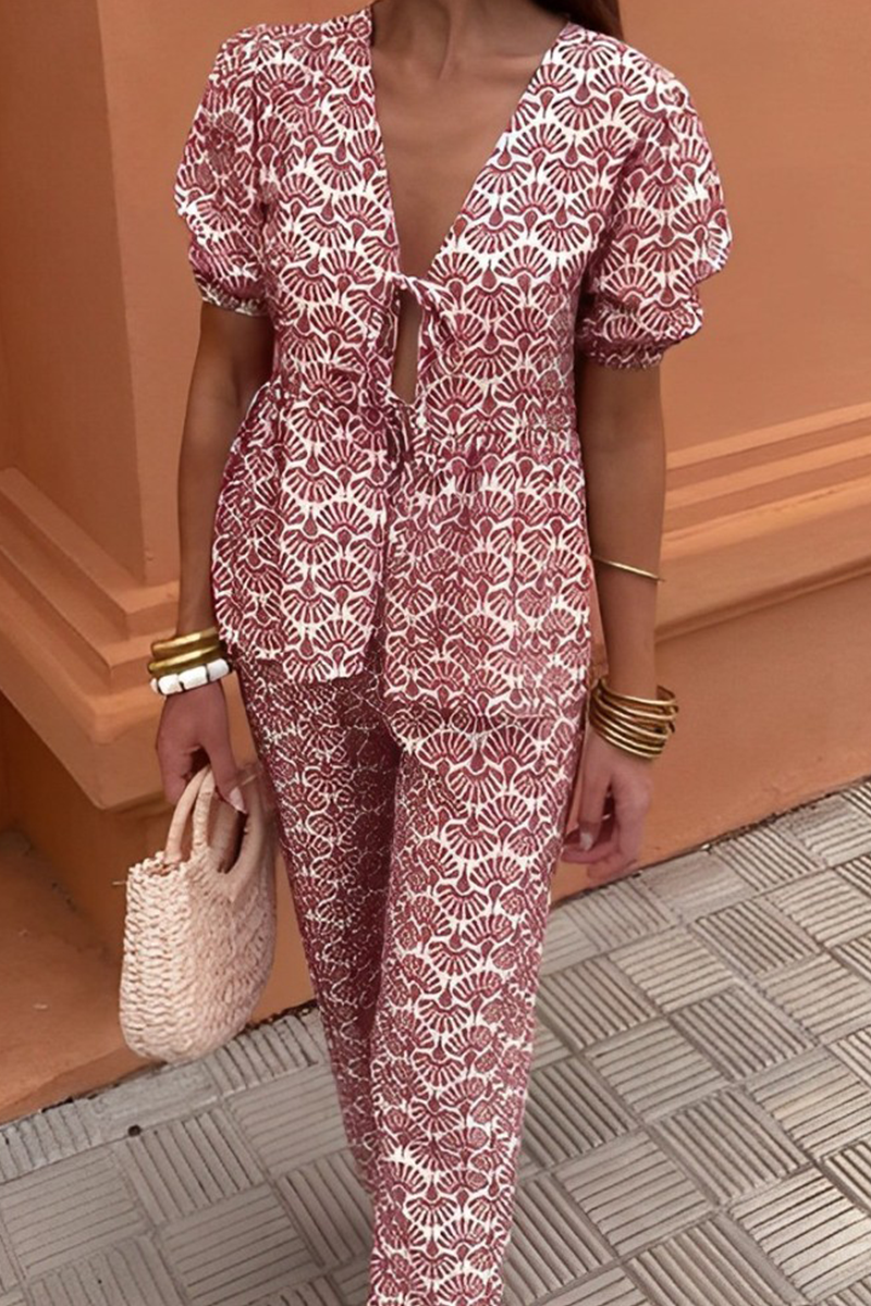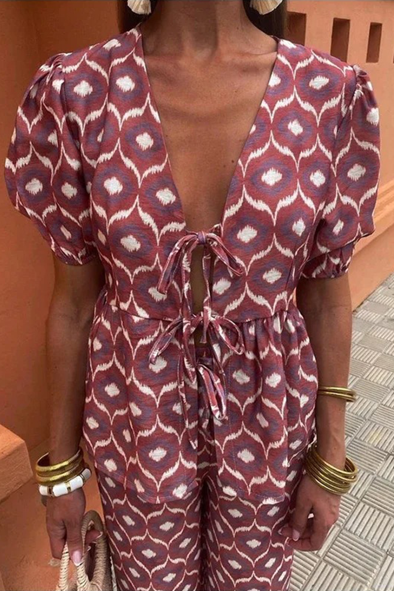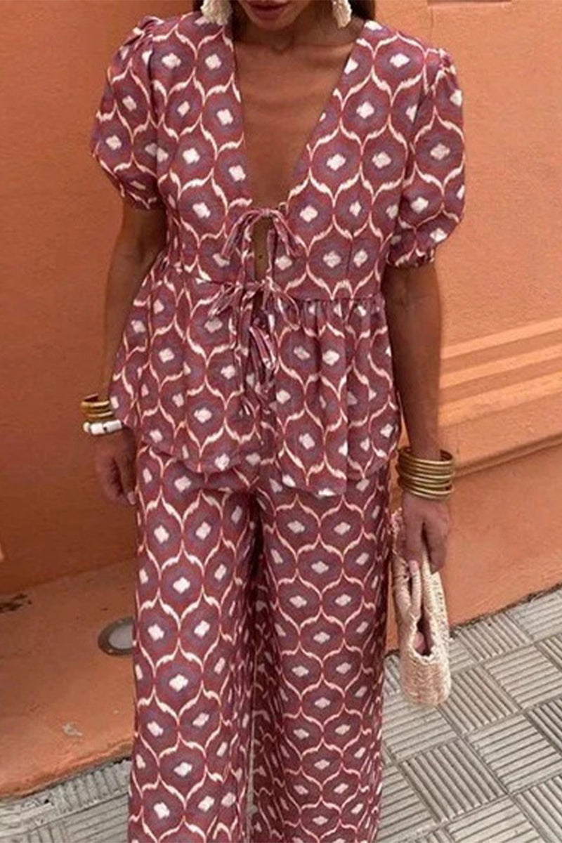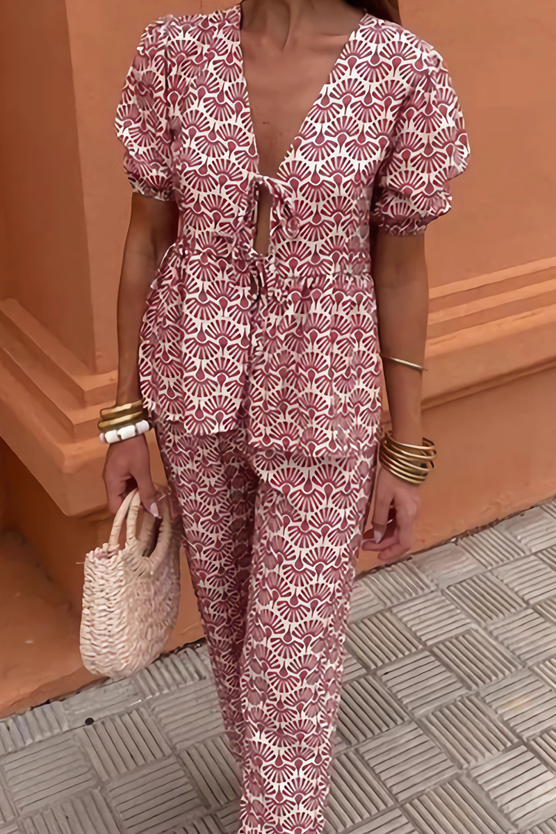 Lässiger, täglicher Zweiteiler mit Schnürung, V-Ausschnitt und kurzen Ärmeln (3 Farben)