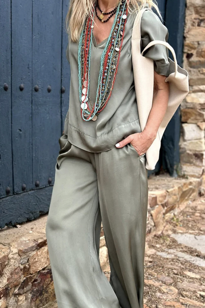 Lässiger, schlichter Zweiteiler mit einfarbiger Tasche, V-Ausschnitt und kurzen Ärmeln (3 Farben)