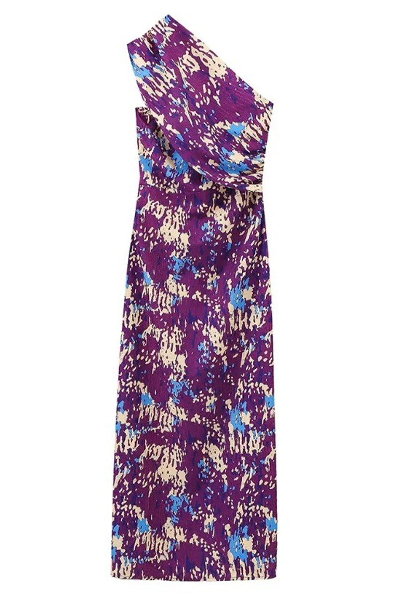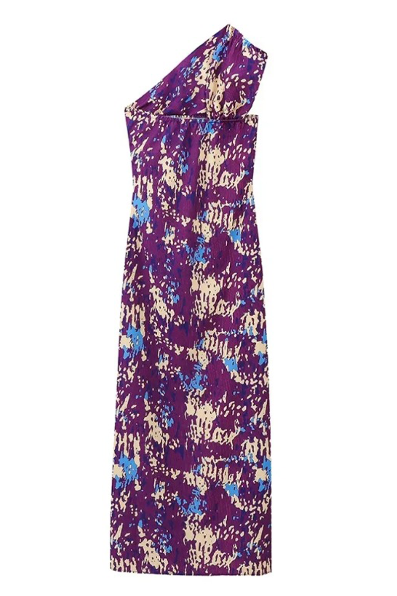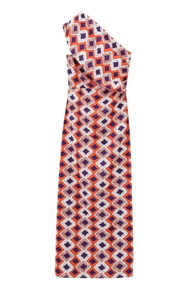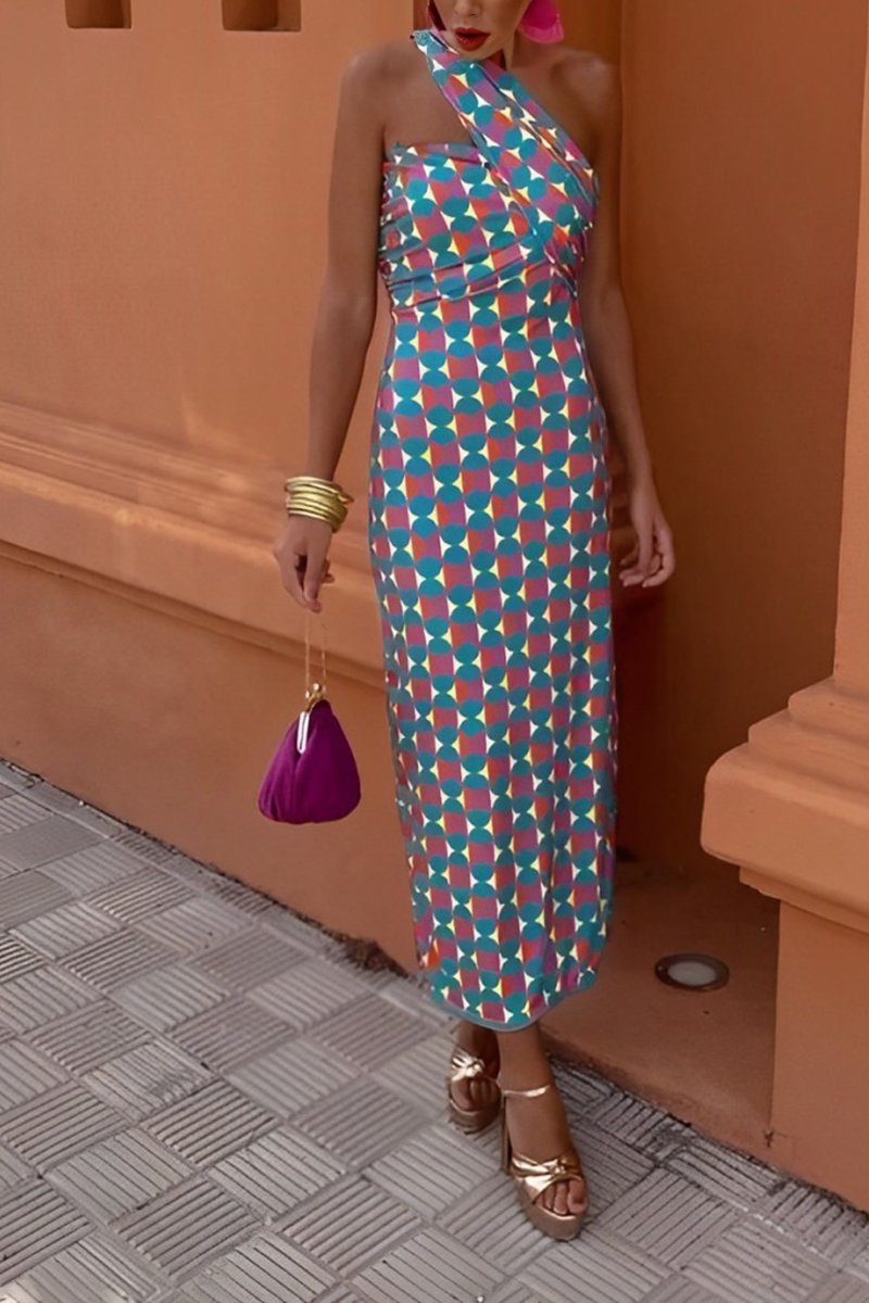 Sexy Prominente Geometrischer Druck Unregelmäßiger Kontrast Schräger Kragen Ärmellose Kleider