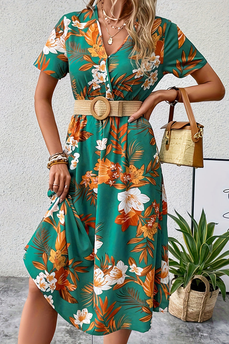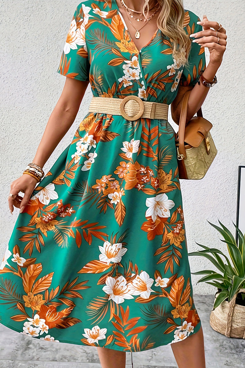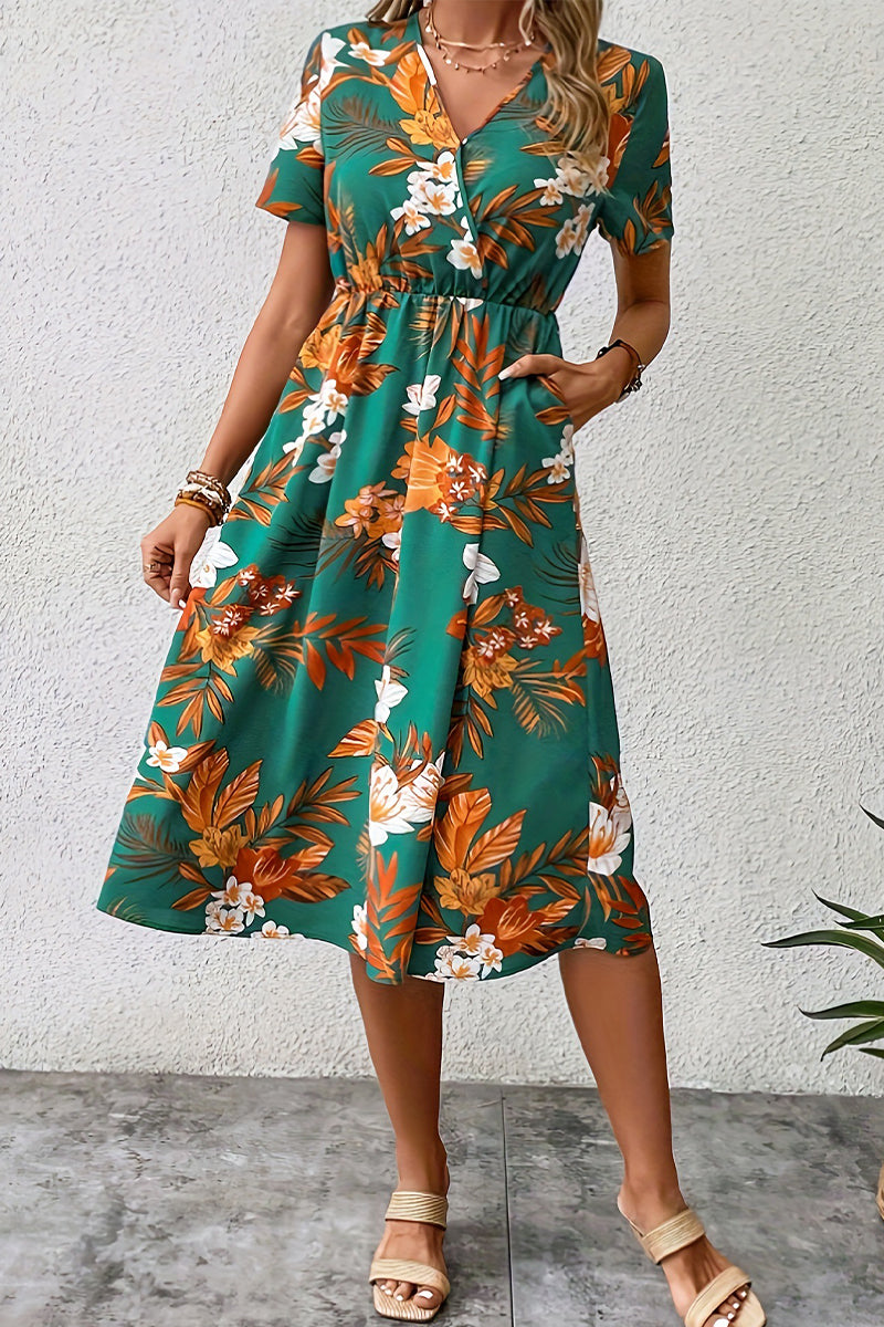 Elegantes Vintage-Kleid mit Blumenmuster und V-Ausschnitt und Taschen
