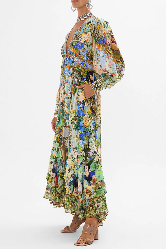 Elegant Floral Print Contrast V Neck Waist Skirt Dresses