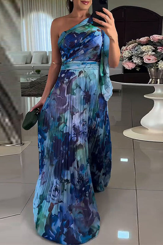 Elegant Floral Print Bow Decor Zipper Pleated Sloping Shoulder One Step Skirt Dresses