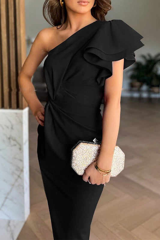 Sexy Solid Color Ruffle Ruched Sloping Shoulder Sleeveless Dresses