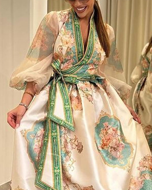 Daily Elegant Landscape printing Lace Up V Neck A Line Dresses