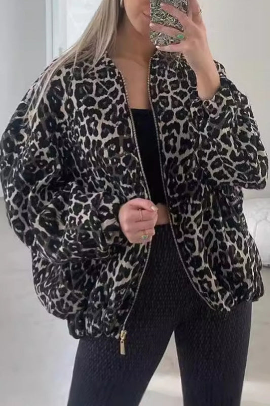 Casual Leopard Print Patchwork Zipper Collar Outerwear