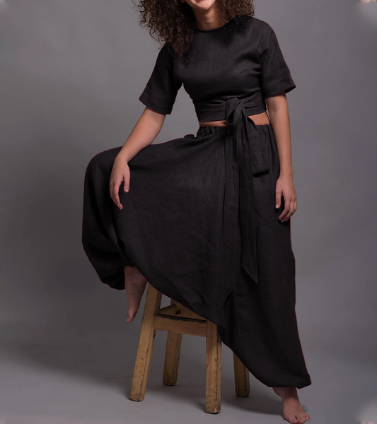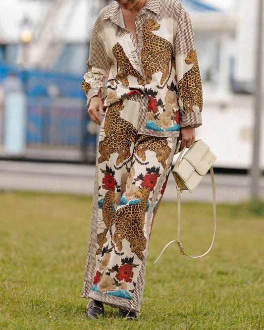 Casual long printed shirt and cotton and linen trousers two-piece set