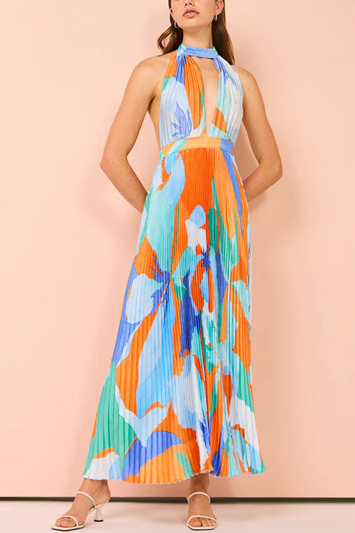 Deep V Neck Halter Backless Printed Maxi Pleated Dress