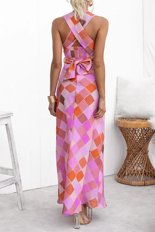 Criss Cross Bow Back Sleeveless Plaid Maxi Dress