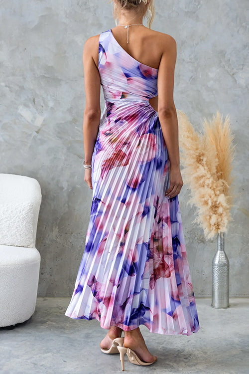Chicest One Shoulder Cut Out Pleated Floral Print Maxi Dress