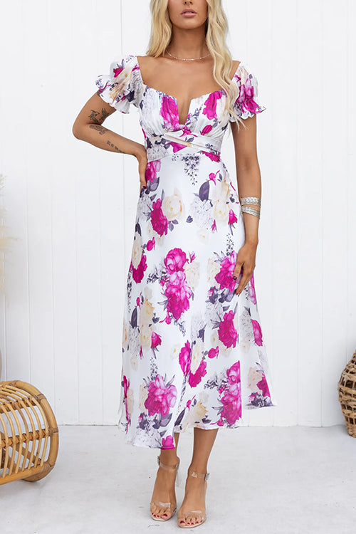 Midikleid mit Ballonärmeln, Bindeband hinten und hoher Taille, Blumendruck