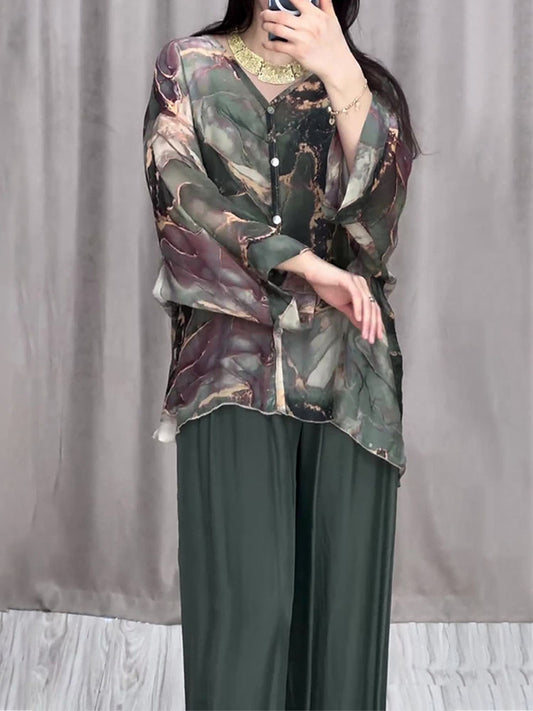 Rosiedress Blusa de manga larga con estampado de plátano Camisa Pantalones anchos Conjunto de ropa de resort