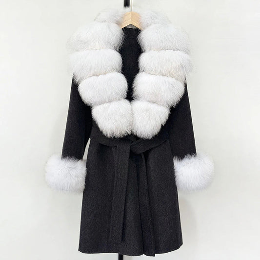 Women’s Belted Wool Coat with Genuine Fur Trim