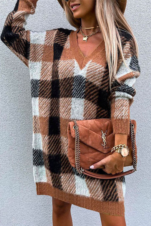 Rosiedress Vestido suéter a cuadros de manga larga con cuello en V
