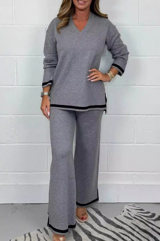 Casual Daily Stripe Patchwork Slit Contrast V Neck Long Sleeve Two Pieces(3 Colors)