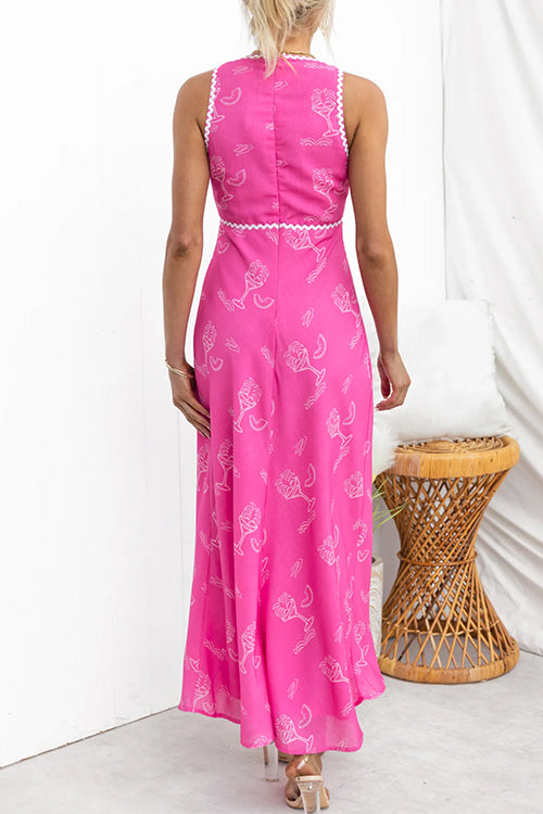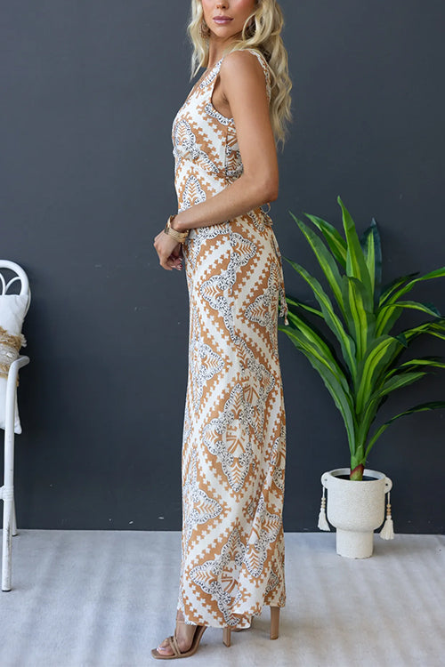 Vestido largo estampado sin mangas con cuello en V y cintura alta