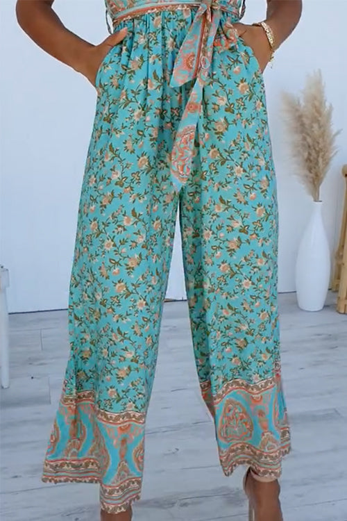 Mono con estampado floral, pierna ancha, cintura anudada, sin mangas, con cuello en V