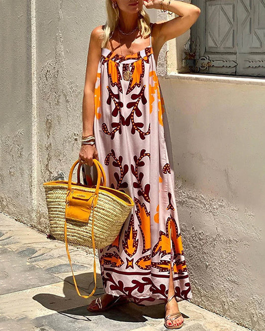 Robe mi-longue imprimée à découpes et manches lanternes avec nœud dans le dos