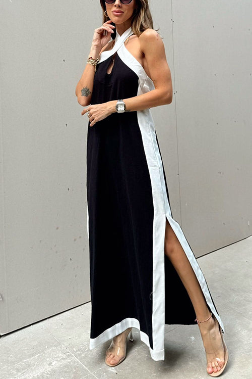 Robe longue fendue sur le devant à blocs de couleurs et col en V sans manches