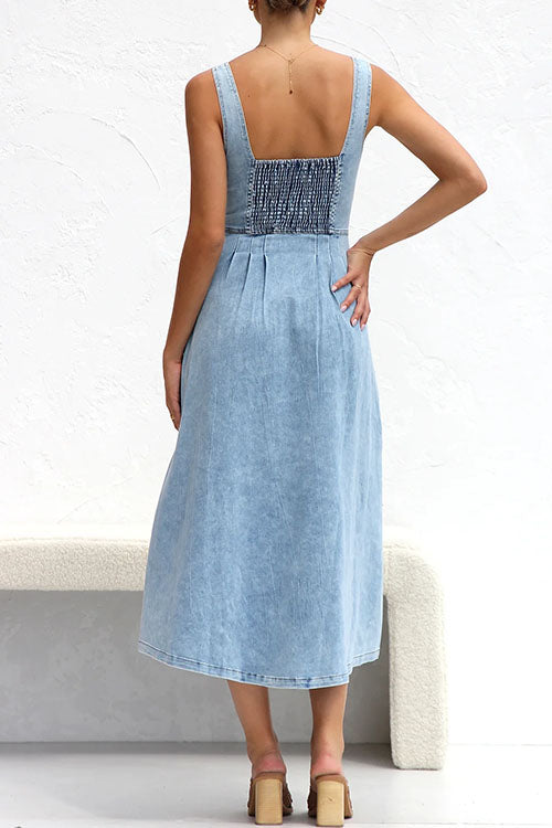 Robe camisole mi-longue en denim à poches boutonnées et effet usé
