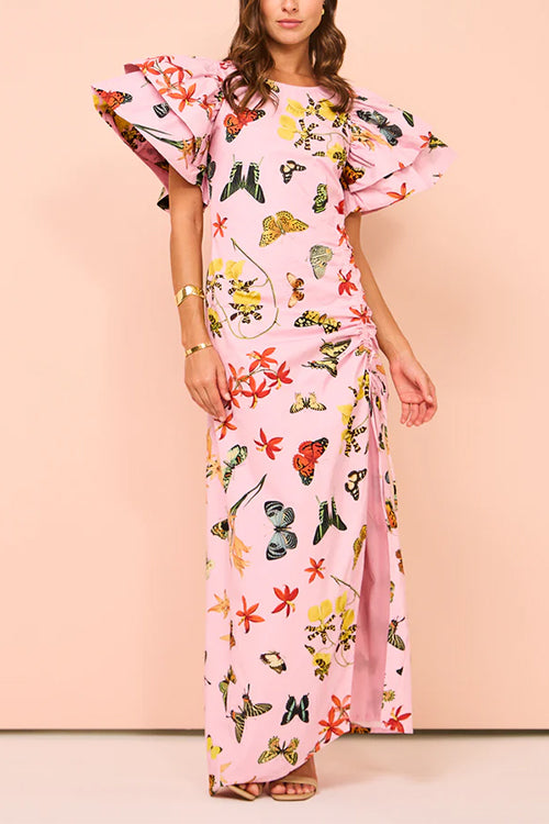 Robe longue imprimée fendue avec cordon de serrage et manches à volants
