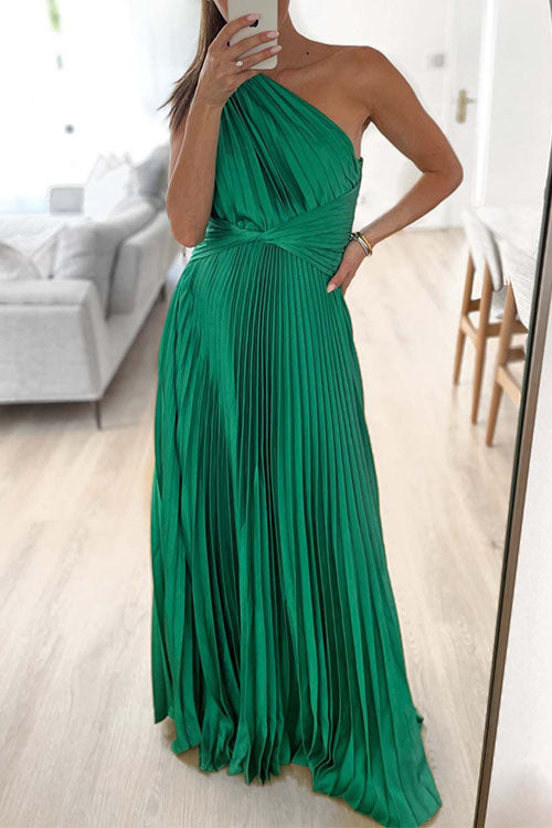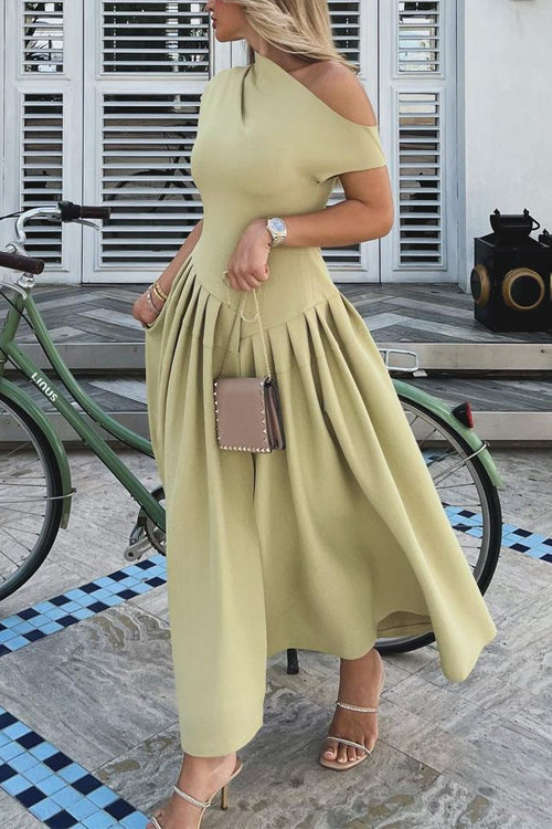 Robe longue trapèze plissée à épaules asymétriques élégante