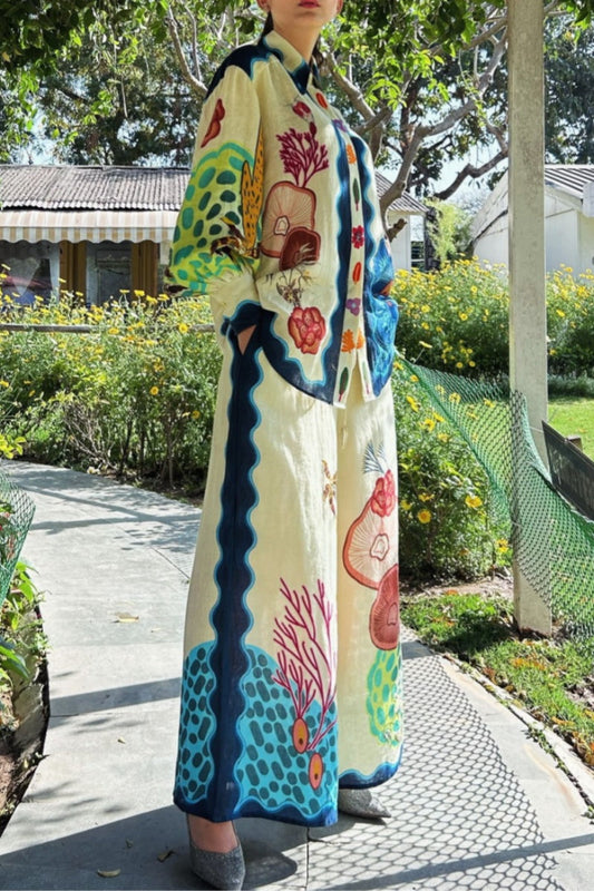 Décontracté Rue Fleurs Imprimé Poche À Lacets Boutons Col Rabattu Manches Longues Deux Pièces