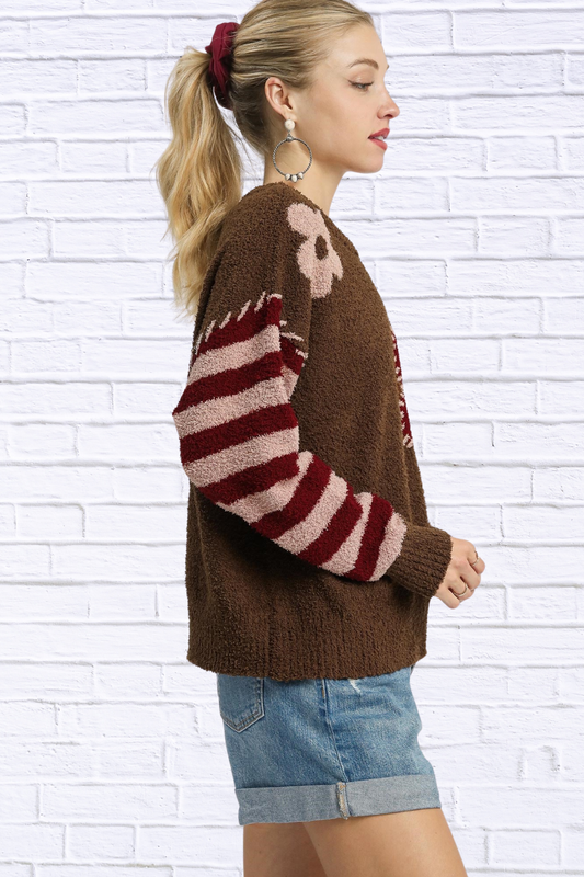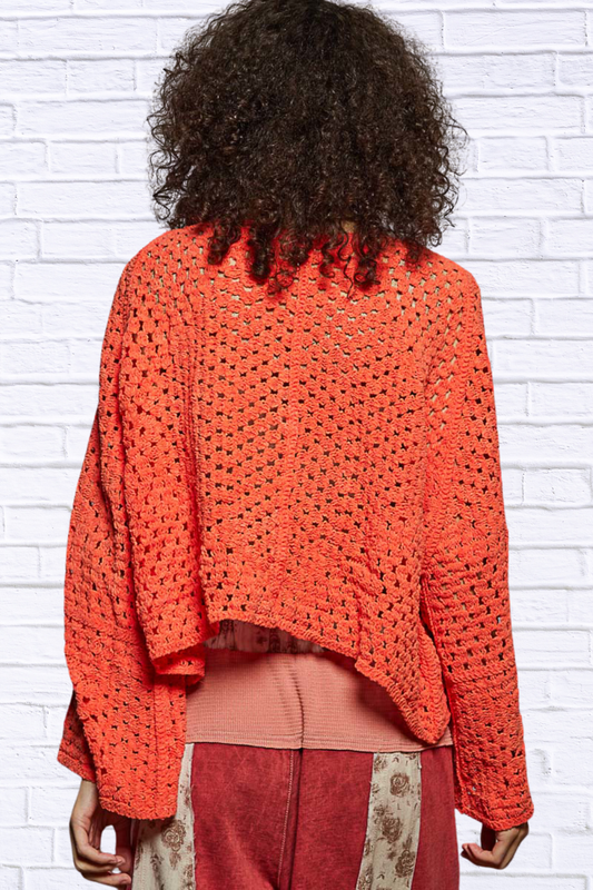 POL Openwork V-Neck Chenille Cardigan with Contrast Floral