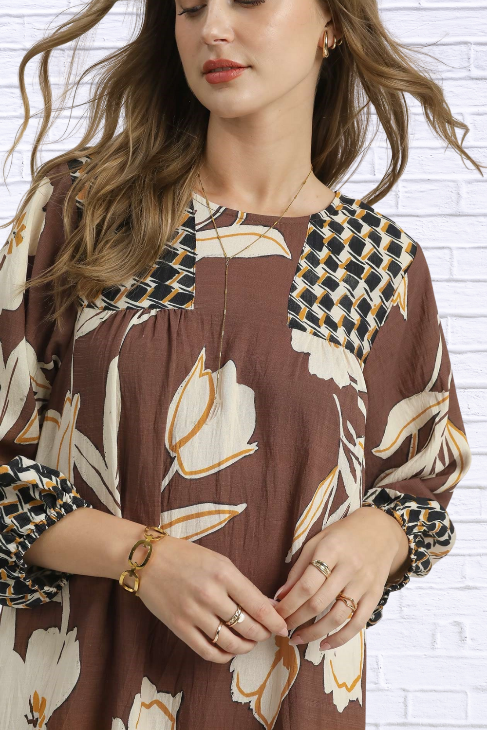 Covered in a delicate brown-and-beige floral print, this dress exudes timeless charm and is perfect for fall brunch dates, weekend getaways, weddings, or vacation evenings. Lightweight fabric and a relaxed fit make it as comfortable as it is stunning.