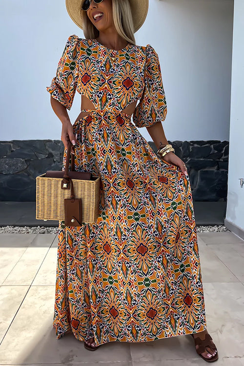 Robe longue de vacances imprimée à lacets et manches bouffantes