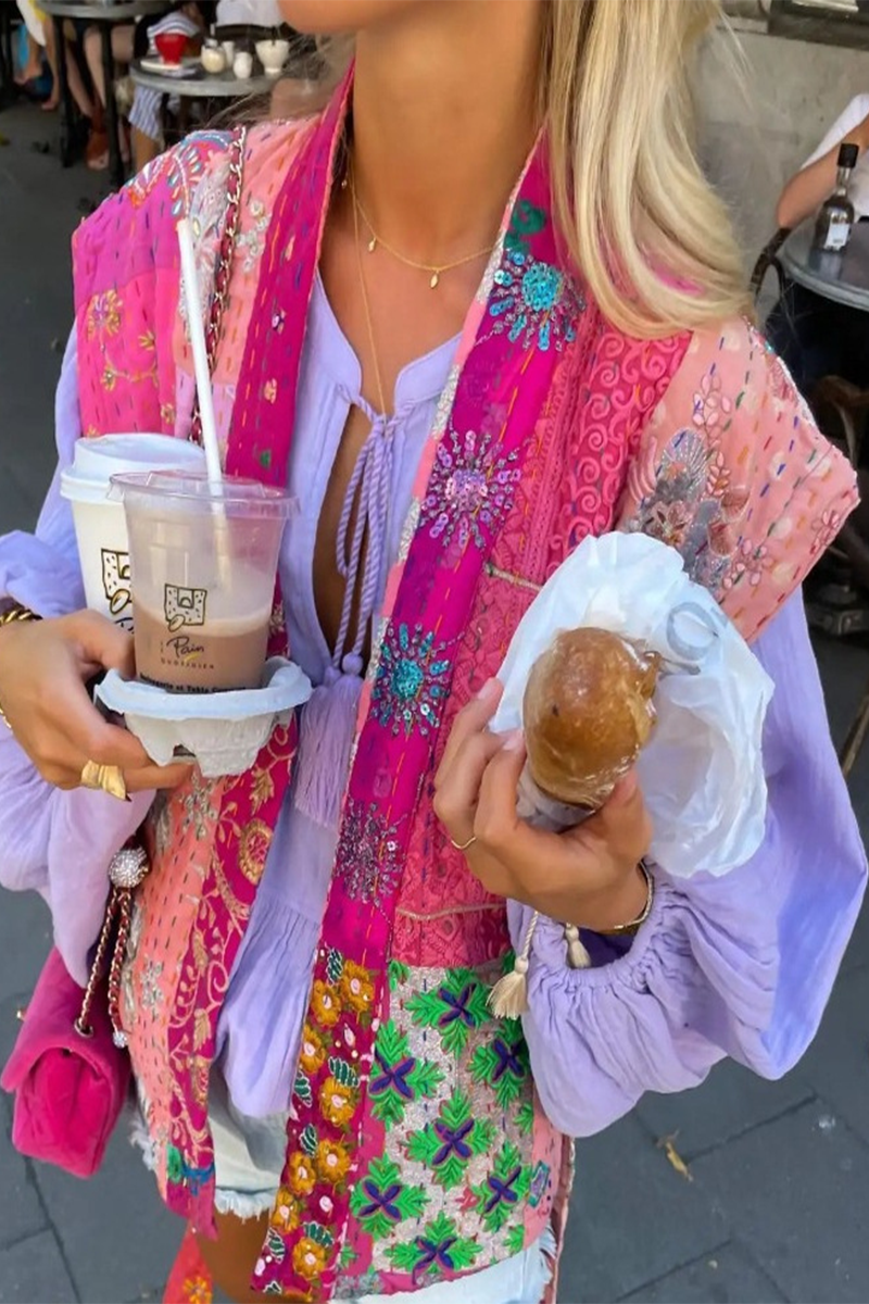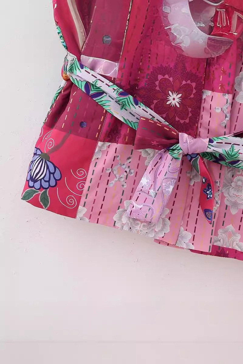 Hauts décontractés à col en V et imprimé floral à lacets et patchwork contrasté