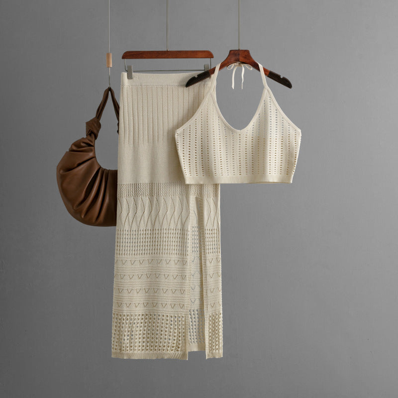 Women Clothes Short Summer Vest Top Two Piece High Waist Slimming Hollow Out Cutout Split Hip Skirt