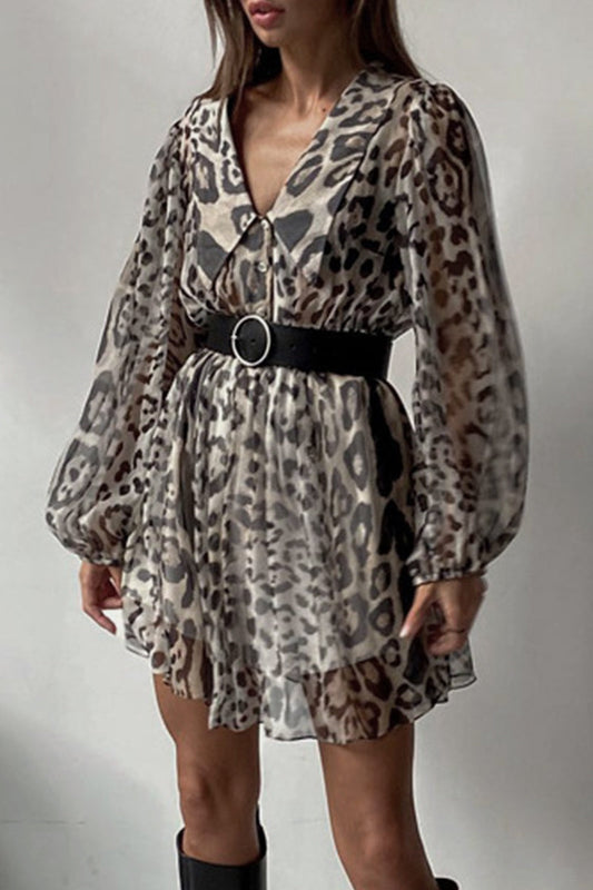 Robe trapèze vintage élégante en patchwork léopard avec ceinture et col rabattu