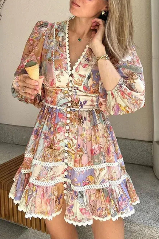 Robe trapèze à col en V et boutons imprimés vintage élégants