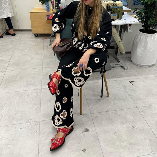 Vintage élégant boutons floraux col rabattu manches longues deux pièces