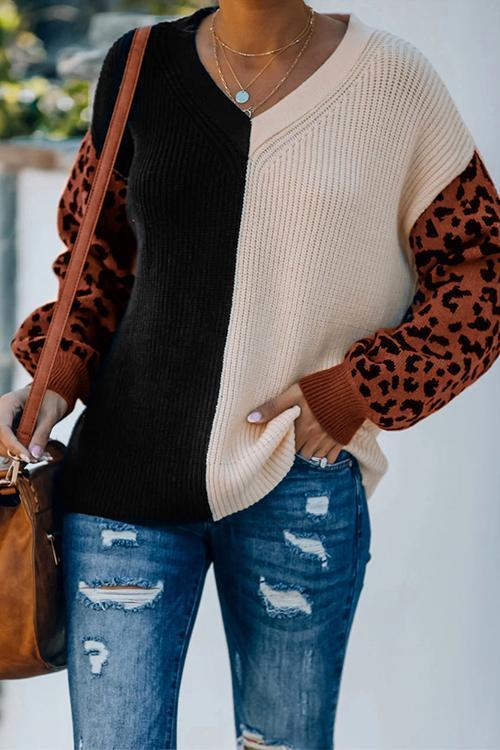 Pull confortable à col en V et imprimé léopard