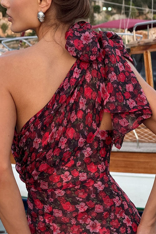 Bow One Shoulder Ruffle Trim Irregular Floral Maxi Dress