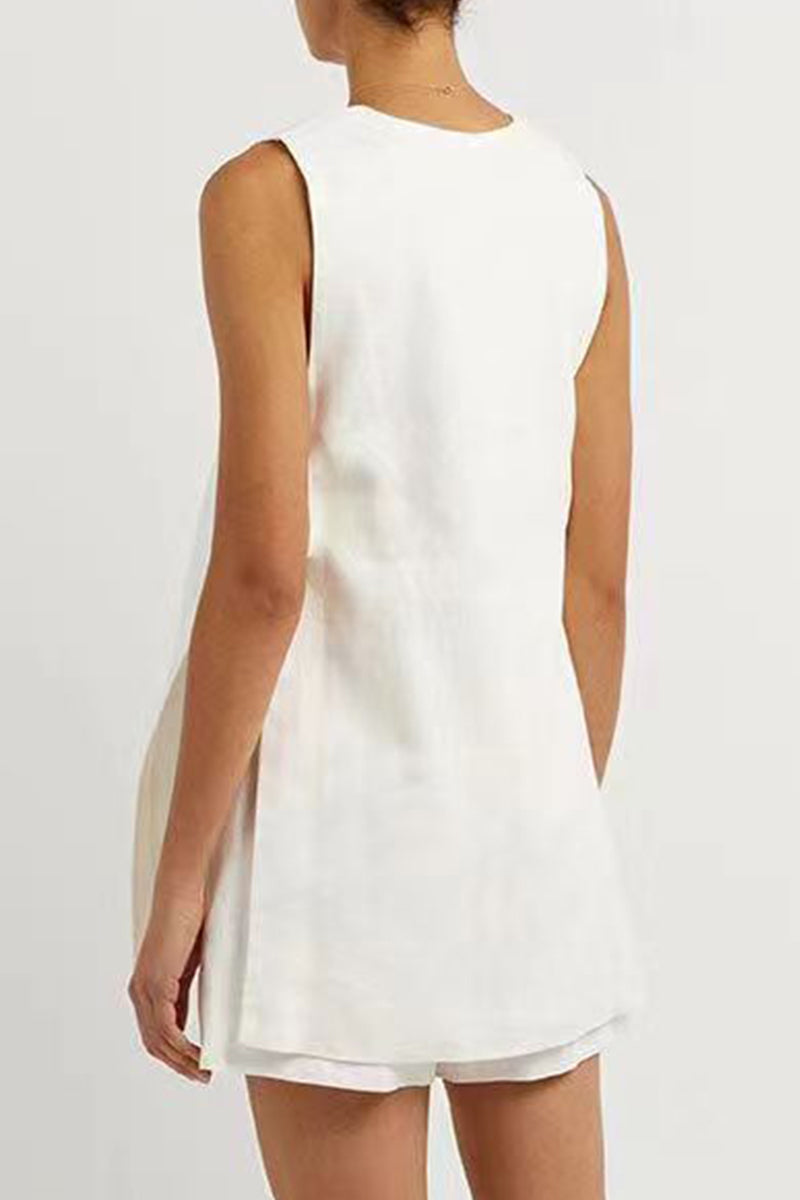 Casual British Style Solid Pocket Buckle V Neck Sleeveless Two Pieces