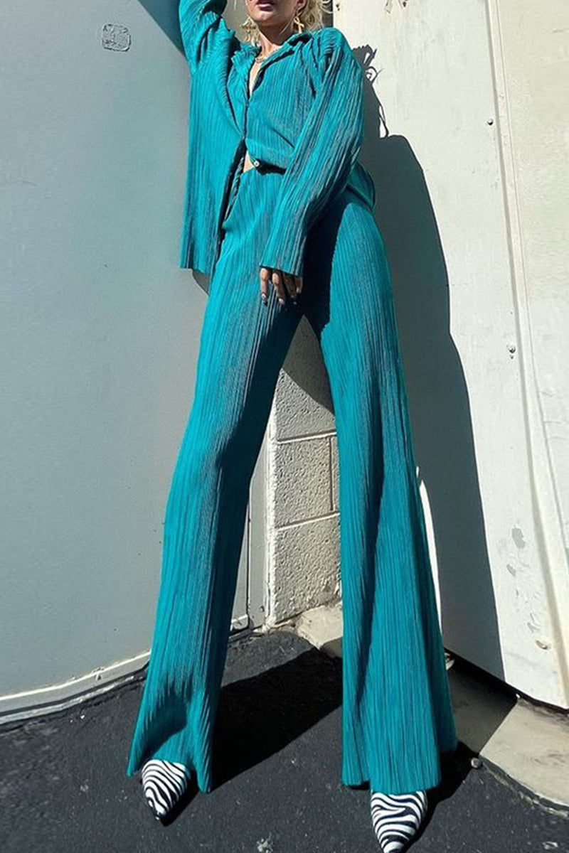 Casual Solid Buttons Fold Turndown Collar Long Sleeve Two Pieces
