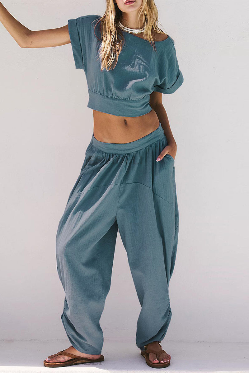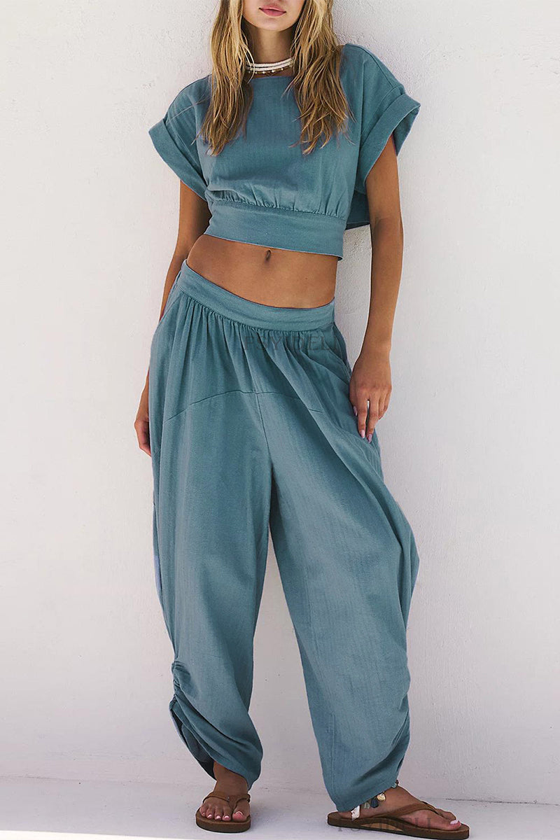Casual Solid Hollowed Out Strap Design O Neck Short Sleeve Two Pieces