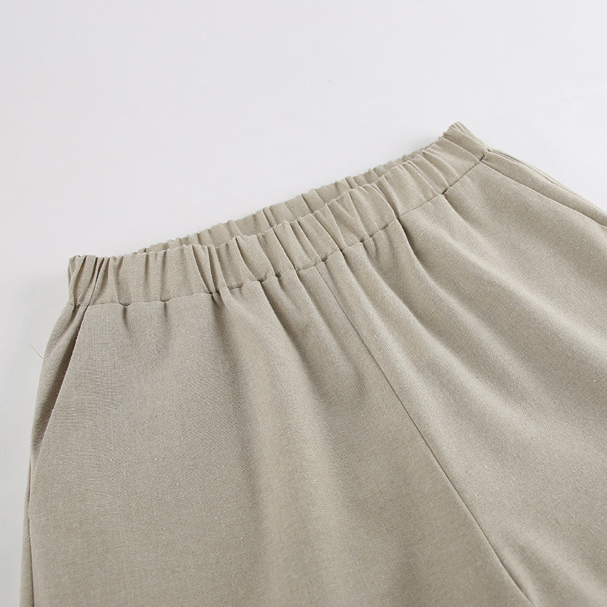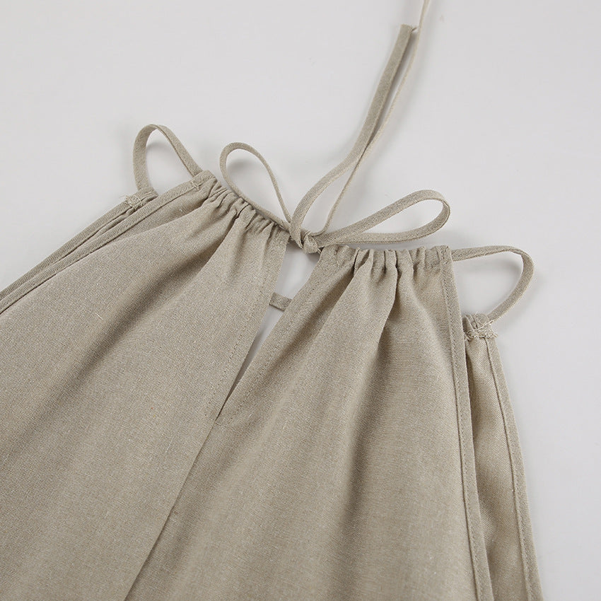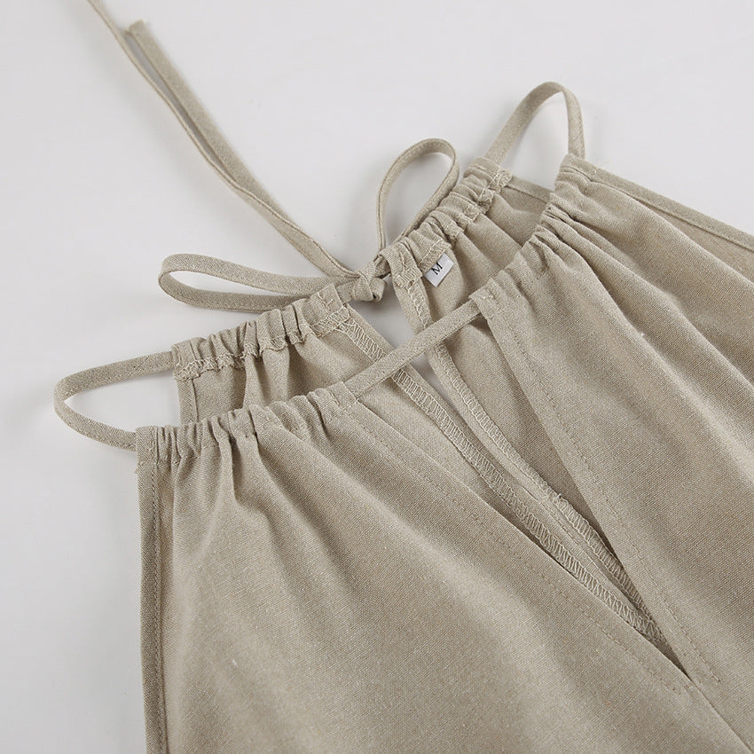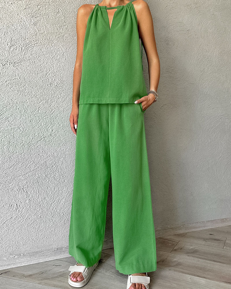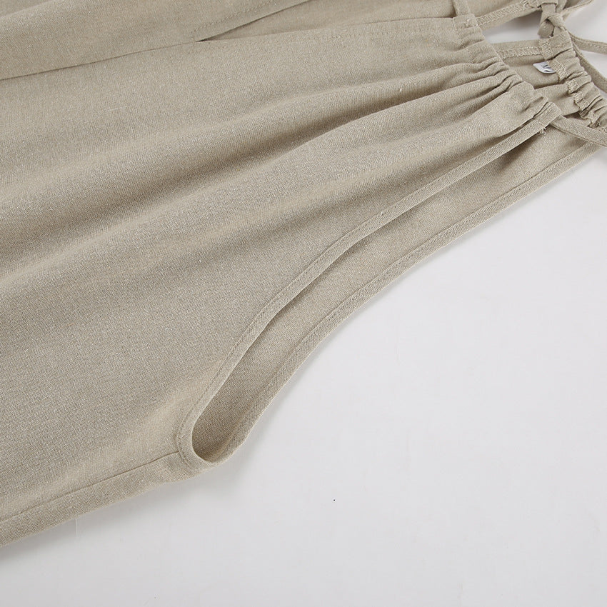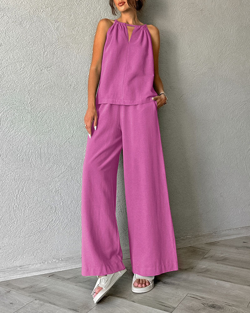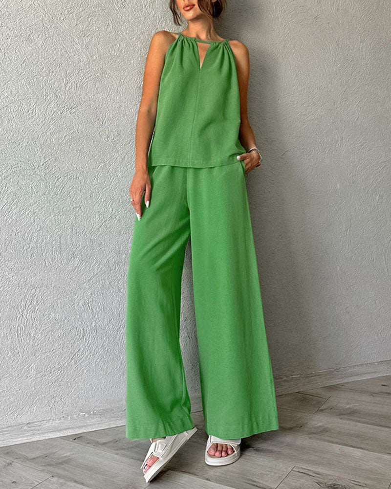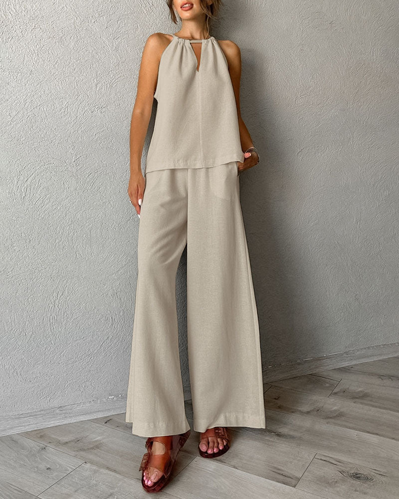 Cotton And Linen Cut-Out Lace-Up Vest & Wide-Leg Pants Two-Piece Set