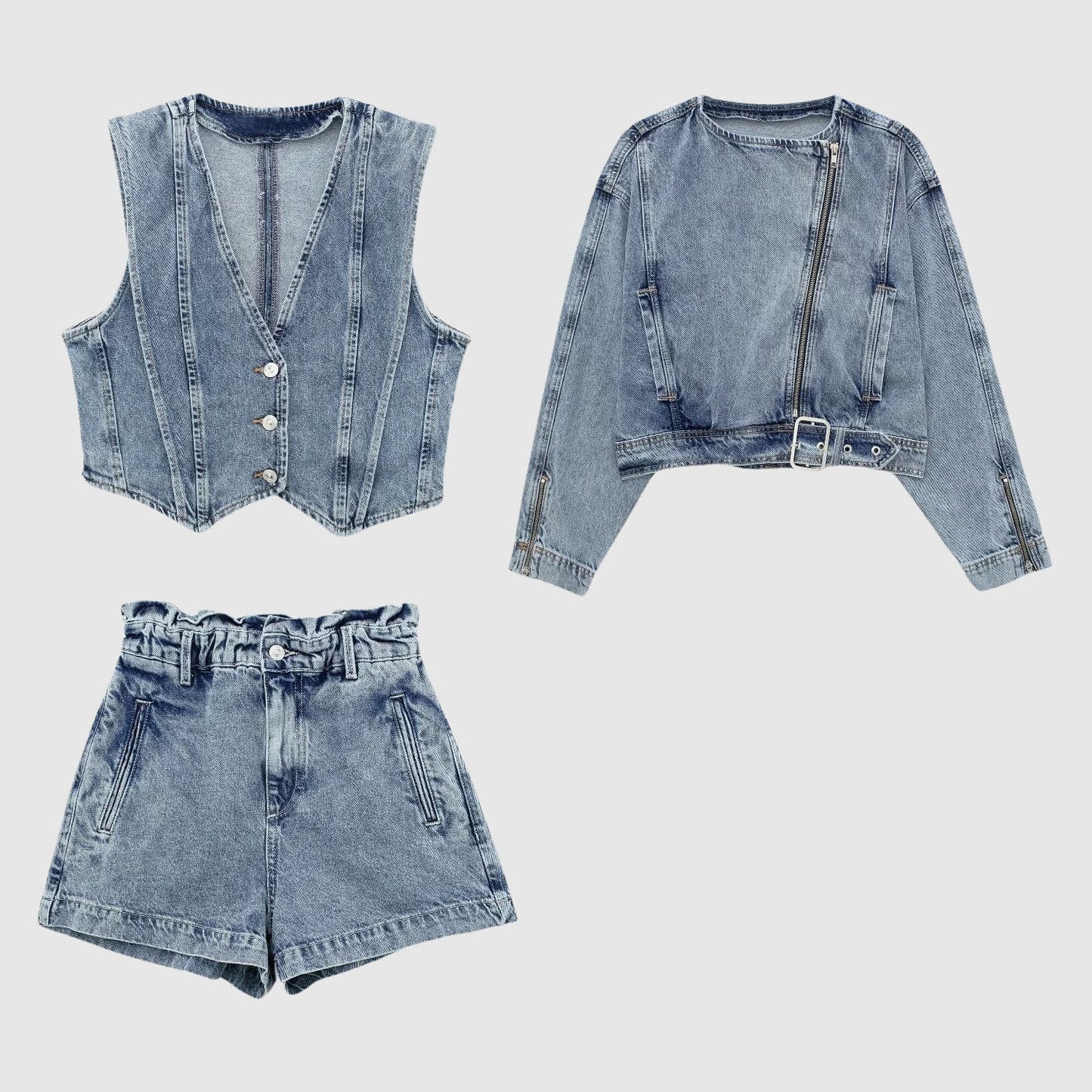 Crafted from durable denim fabric, the Elise Leroy Chic Denim Set features a sleek jacket, a fashion-forward vest, and trendy shorts, offering versatility and edgy flair to your urban wardrobe. Make a bold statement effortlessly with this must-have ensemble, perfect for those who dare to stand out in style.